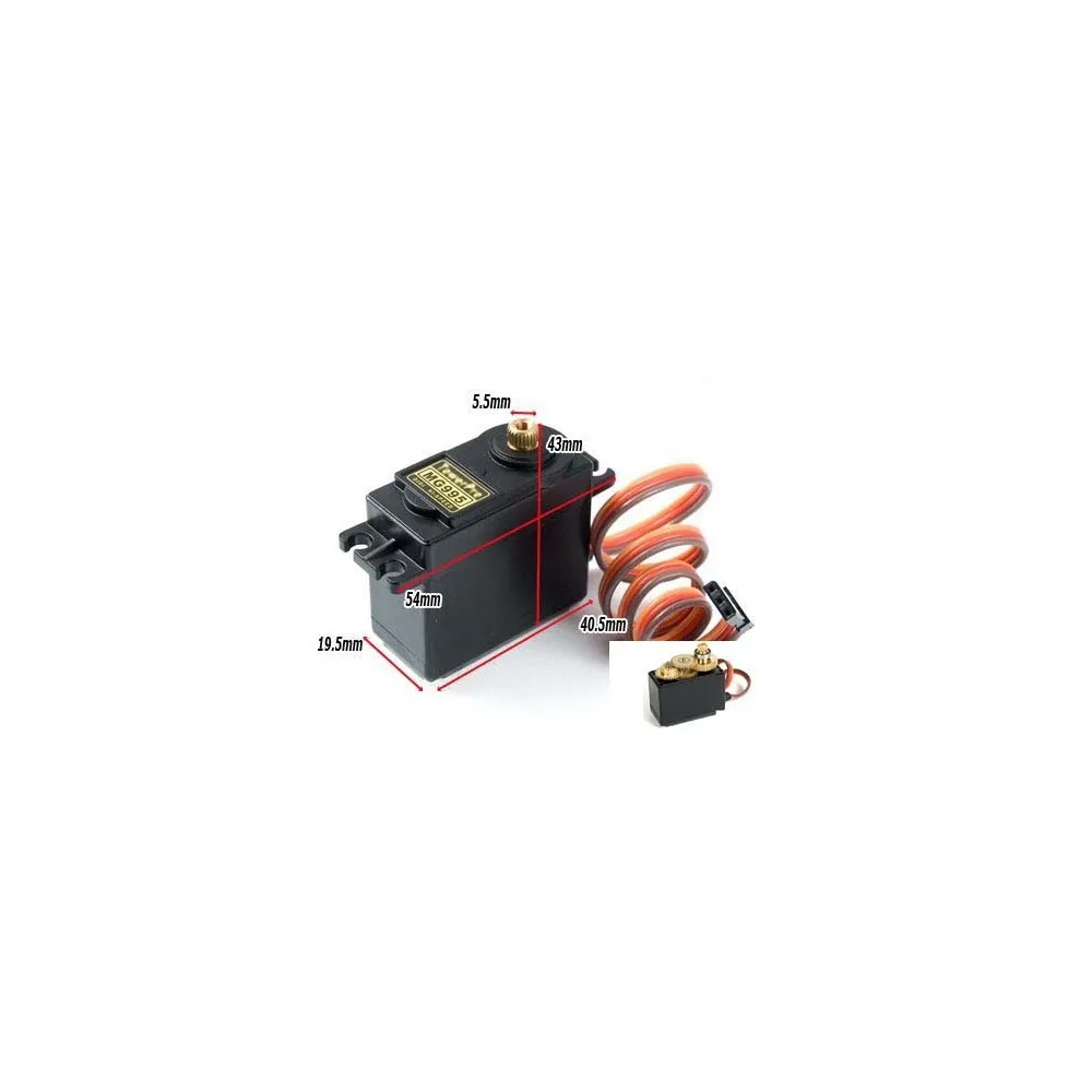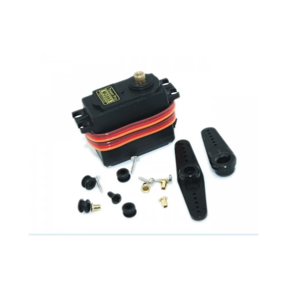 Servomotor MG995 con alto Torque, hasta 15Kg-cm. Robusto, alto rendimiento, compacto, con engranes de Metal, tamaño estandar, incluye accesorios en ABS y tornillos para montarlo en cualquier proyecto.