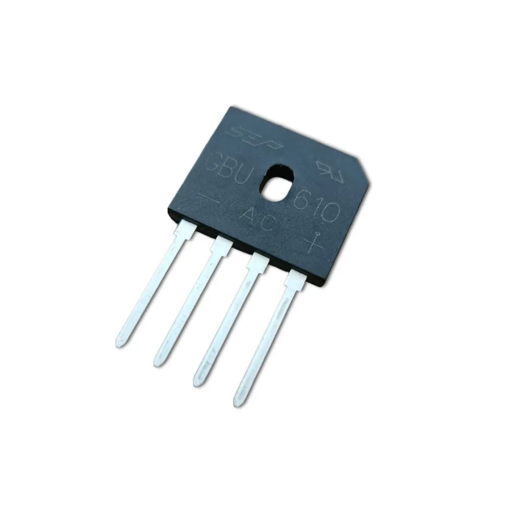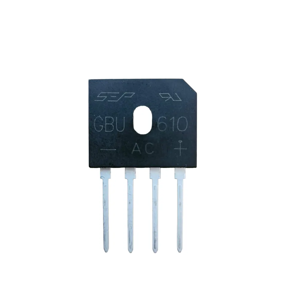 El puente de diodos GBU610 integra cuatro diodos rectificadores en una sola estructura compacta, facilitando el diseño de circuitos y garantizando una rectificación de onda completa estable y segura. Su encapsulado está diseñado para soportar altas tensiones y disipar el calor de manera efectiva.