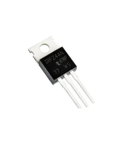 El IRFZ44N es un MOSFET de potencia de canal N muy robusto, conocido por manejar corrientes significativamente más altas que el IRF520. Es un componente fundamental en electrónica de potencia, especialmente para el control de motores de alta carga y sistemas de gestión de energía