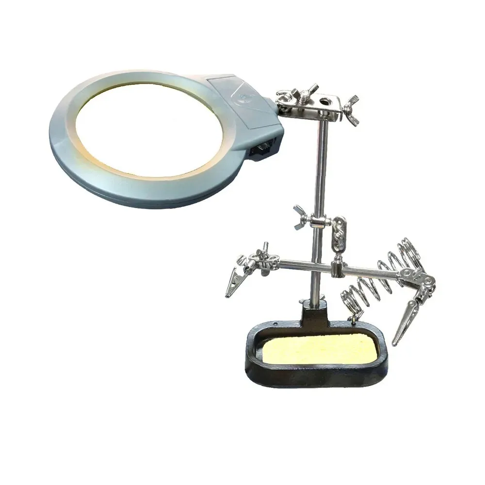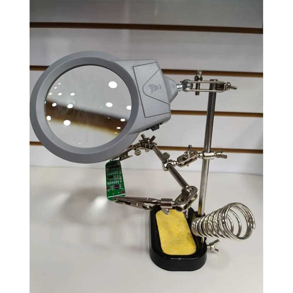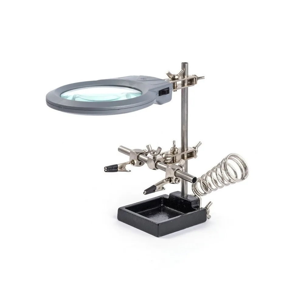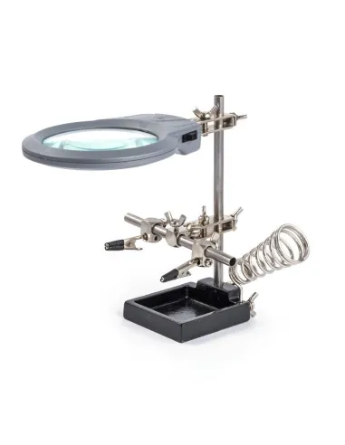 Tercera mano en acero inoxidable con base fundida en hierro, CARACTERISTICAS: Iluminación led requiere de 3 pilas AAA No incluidas. lupa de 90mm base en hierro extructura en acero inoxidable soporte par cautin caimanes, lupa y soporte de caimanes escualizables