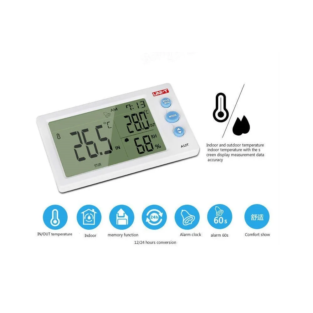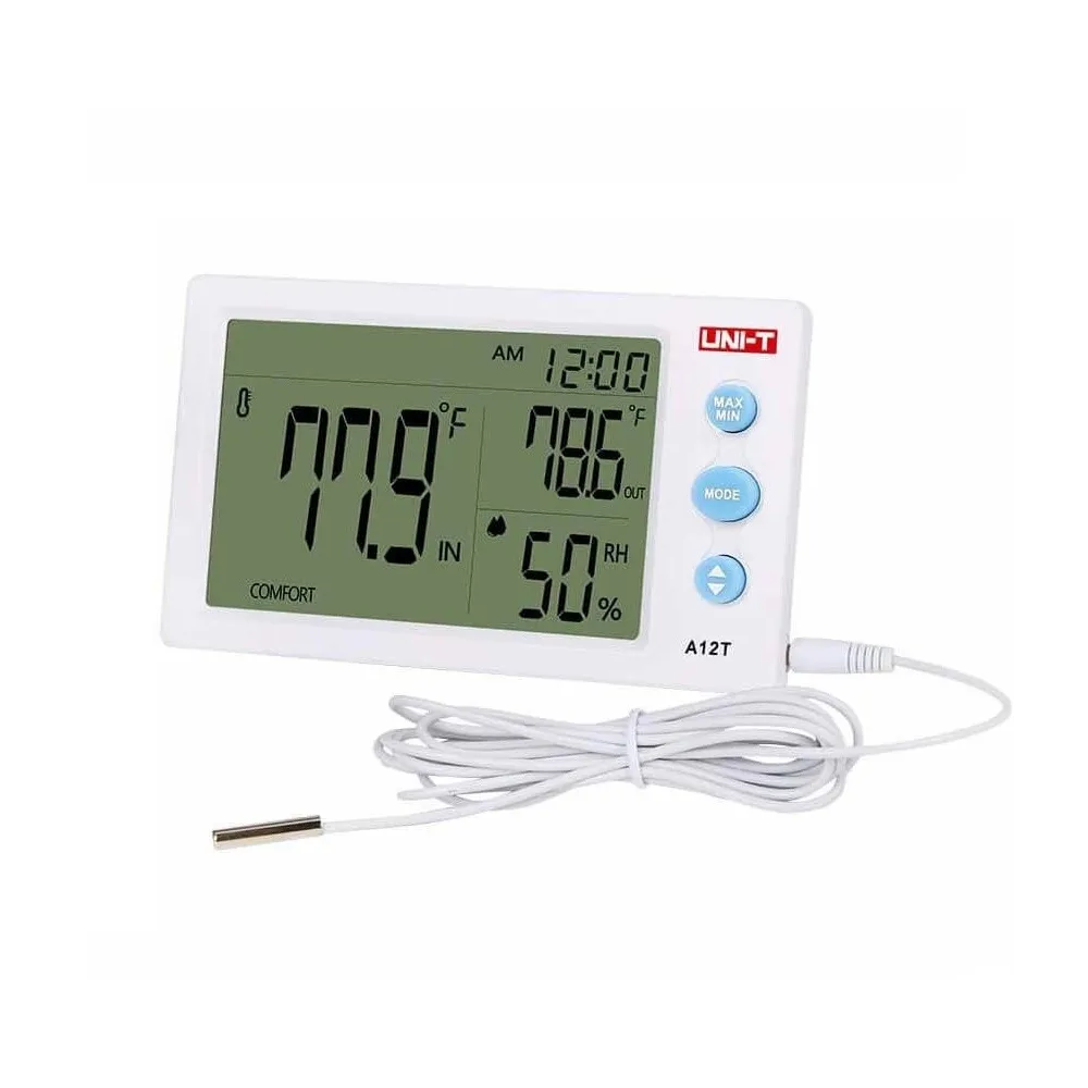A12T mide la temperatura y la humedad en tiempo real y muestra las lecturas en una pantalla grande. Se pueden usar tanto para mediciones en interiores como en exteriores. A12T tiene una sonda de sensor externo adicional para medir temperaturas de dos ubicaciones. Ambos medidores tienen reloj despertador y modo de tiempo 12/24. A12T muestra la clasificación de confort basada en la combinación de temperatura y humedad. El orificio para colgar y el soporte están disponibles para montaje en pared o mesa.