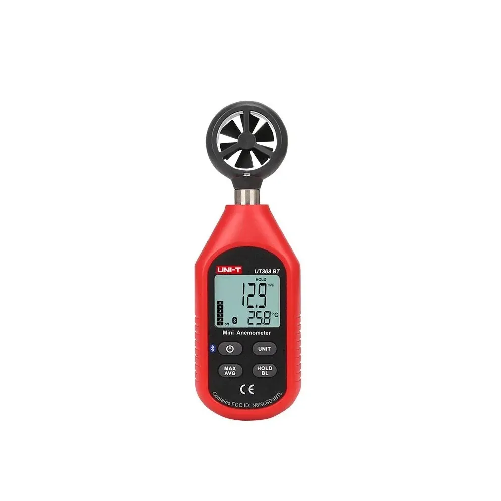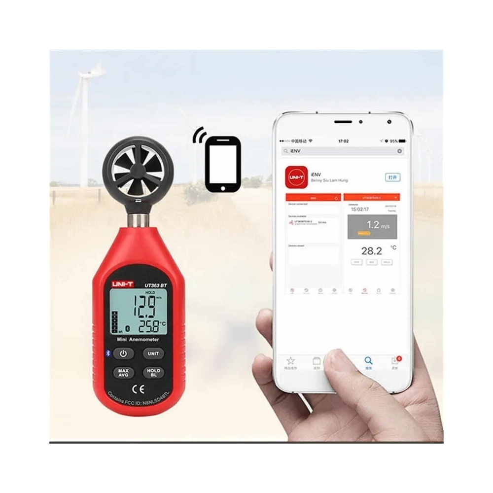UT363BT es un mini medidor de temperatura y velocidad del viento, que puede medir velocidades de viento de hasta 45 m / s. Utiliza Bluetooth para transferir datos y analizar, almacenar y exportar a través de la aplicación móvil personalizada de UNI-T (iENV). iENV se puede descargar desde Google Play, Apple Store o el sitio web de UNI-T buscando ‘iENV’.