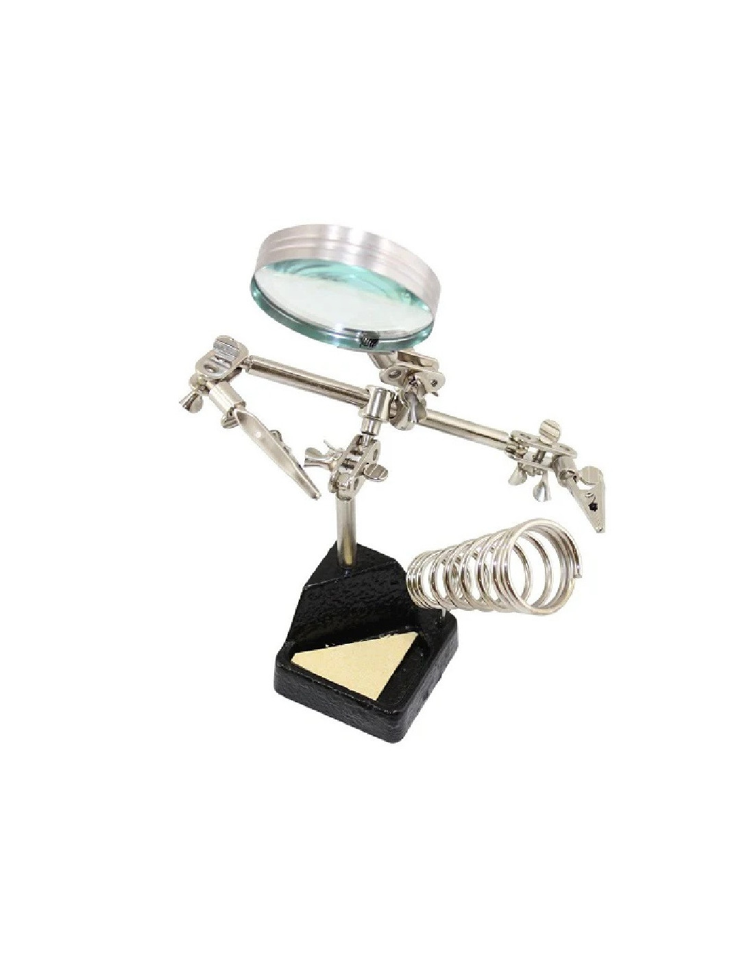 Dos brazos de fijación ajustables con caimanes en acero inoxidable y lupa, la cual puede ser configurada de muchas maneras.