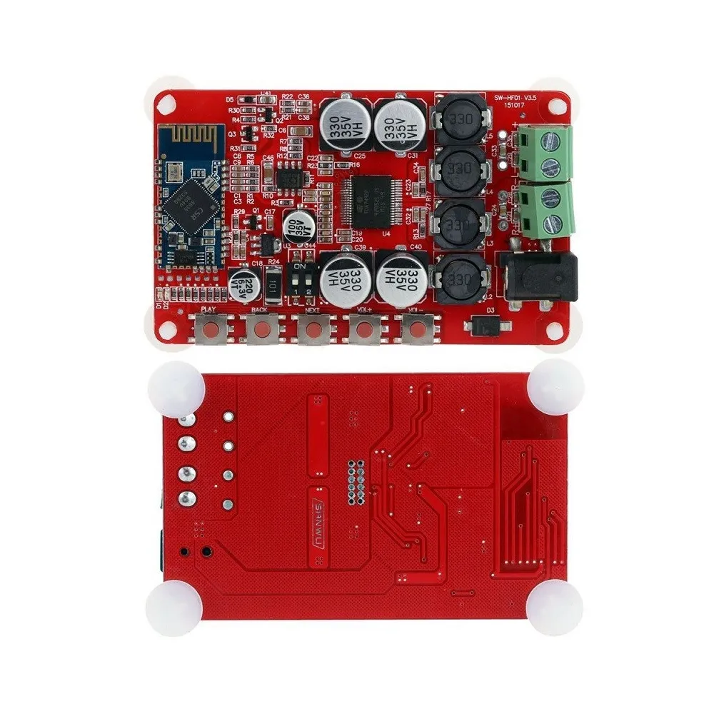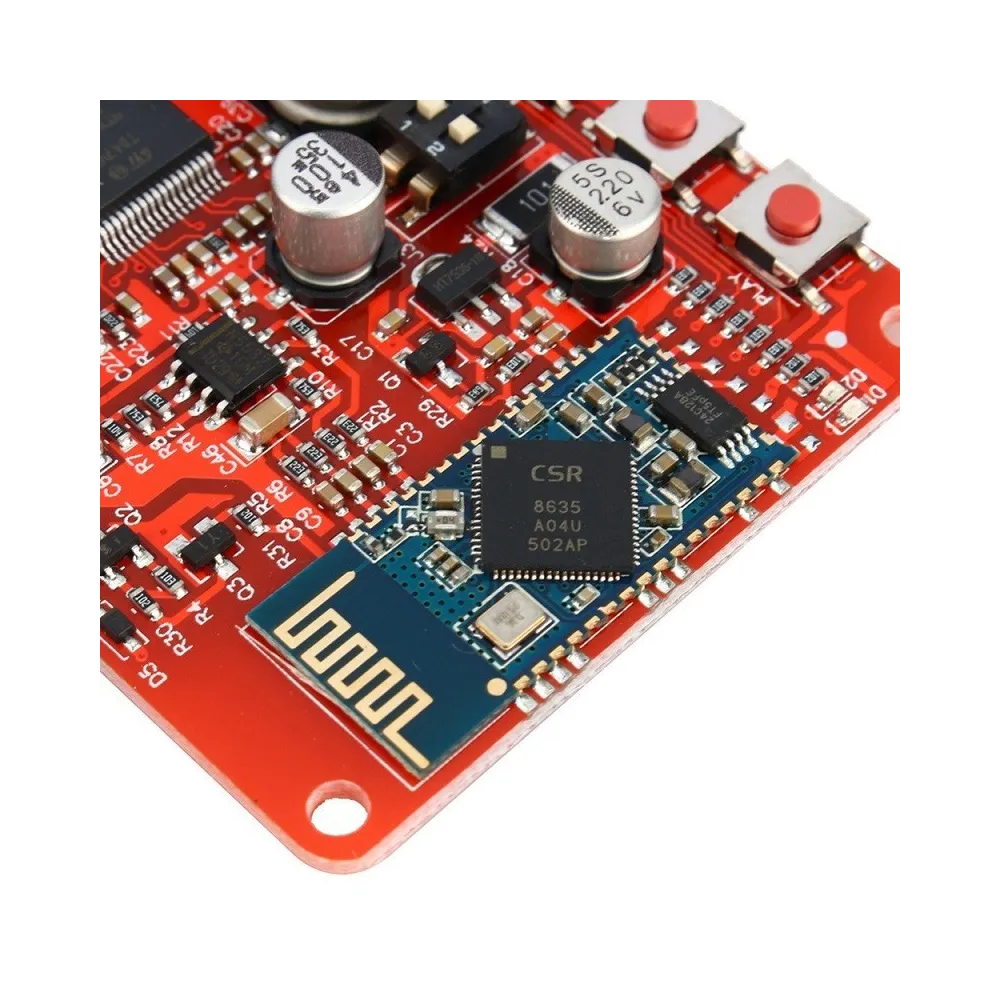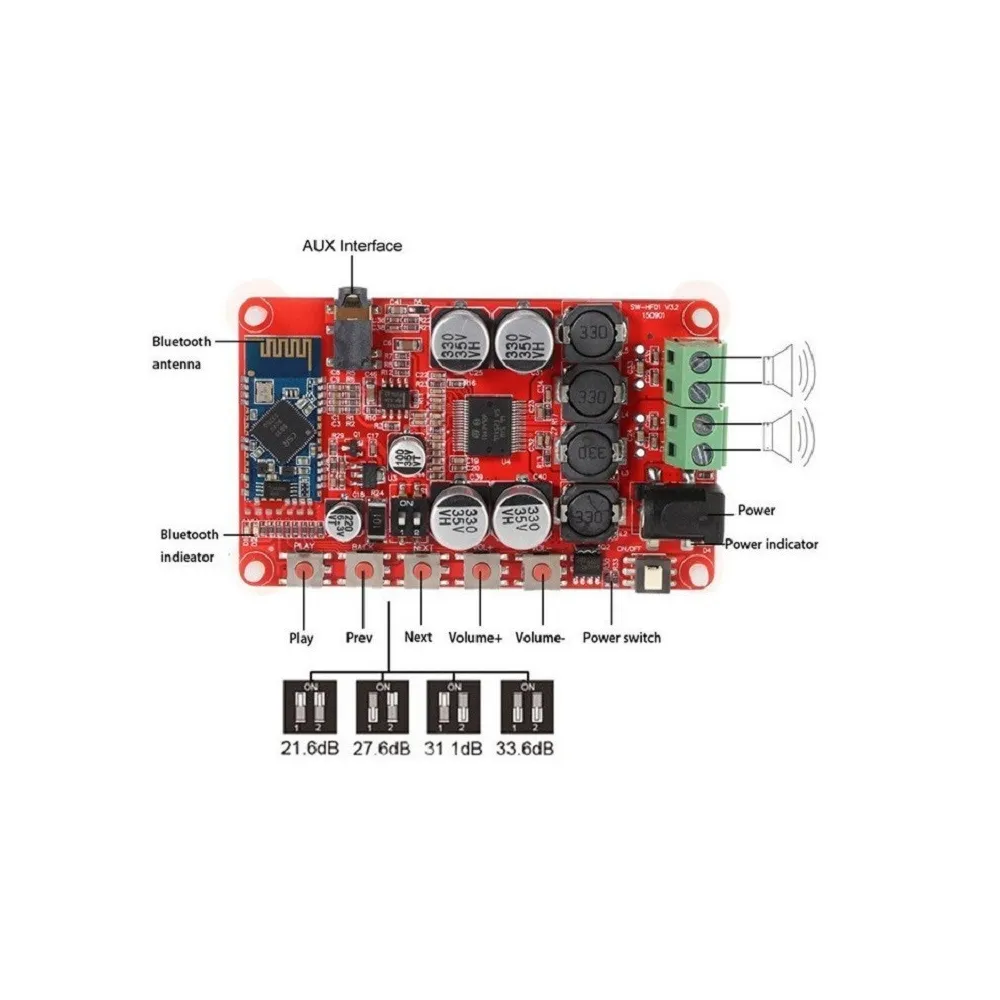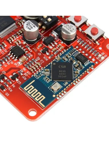 Receptor de audio inalámbrico amplificador equipado con chip TDA7492P y bluetooth 4.0, con salida de audio estéreo 50 + 50W. Posee un ajuste de ganancia (DIP switch) que va desde 21,6dB a 33,6dB. Cuenta con un pulsador táctil integrado el cual controla la reproducción de audio (play, pre, next, V +, V-) ideal para los altavoces estéreo bluetooth DIY.