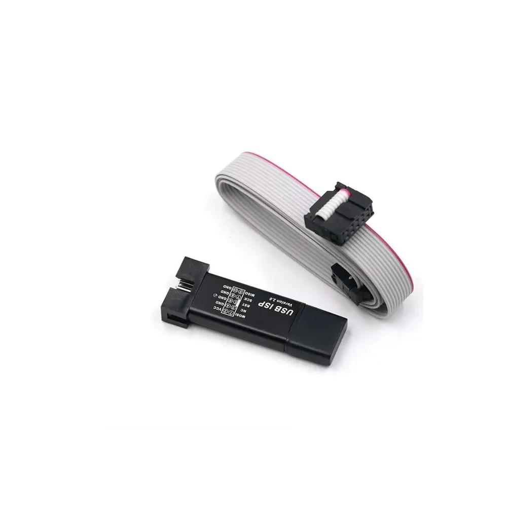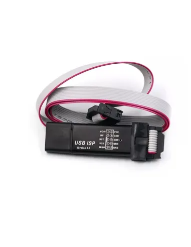 El programador USBasp con una conexión ISP de 10 pines proporciona la interfaz al microcontrolador a una velocidad de programación de 5 KB/seg.