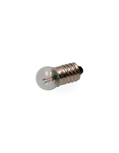 Pequeño bombillo de vidrio con rosca estándar E10, diseñado para trabajar en un rango de 3 a 6 voltios.