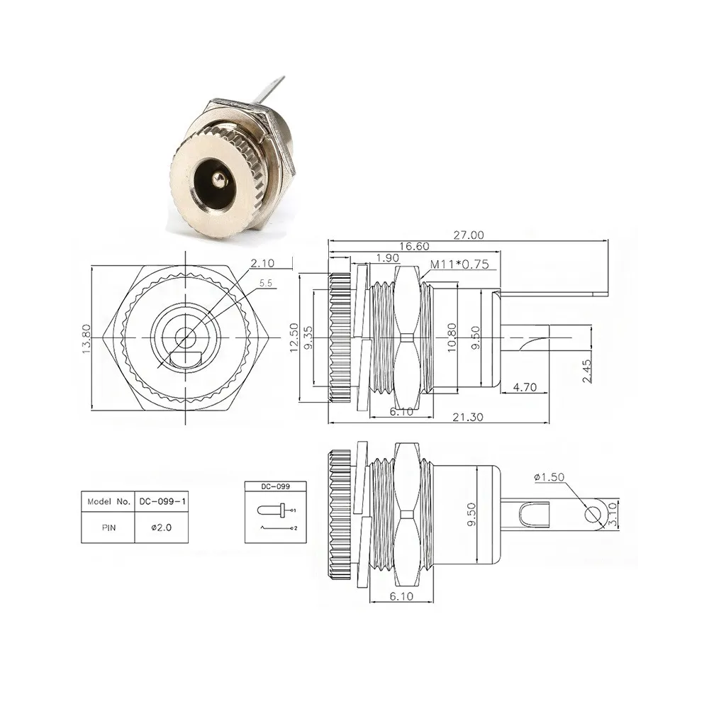 Conector Chasis Hembra para plug Dc de 5.1mm * 2.1 mm Metalico
