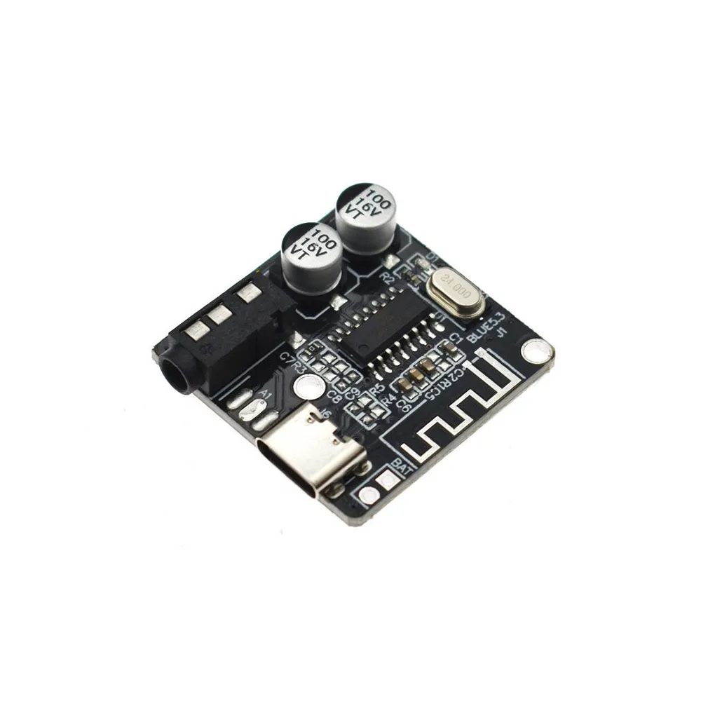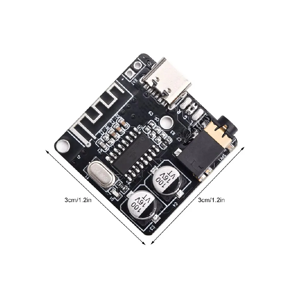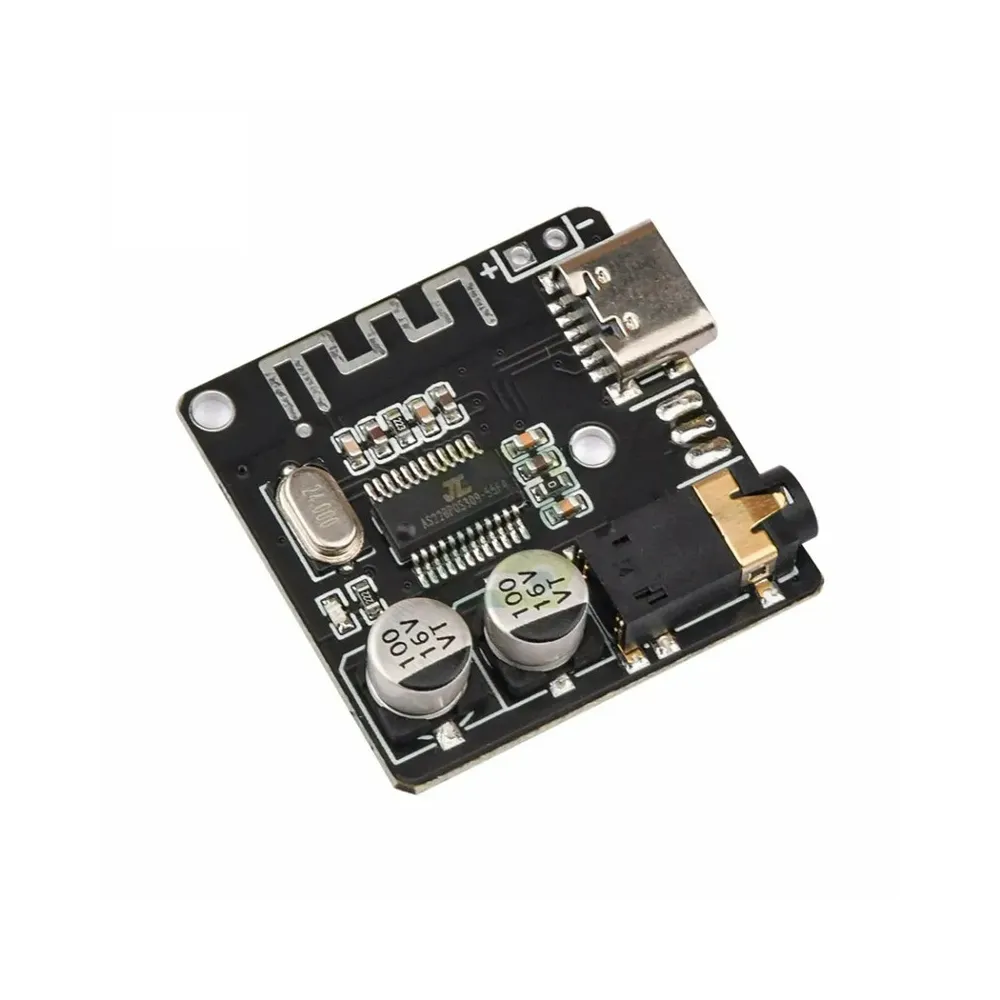 Modulo Receptor de Audio MP3 Bluetooth 5.0 tiene excelentes funciones básicas como Recepcion de larga distancia, Bluetooth 5.0 compatible con retroceso, calidad de sonido sin perdidas, USB-C, salida para plug de audio de 3.5mm y tambien por pornes para soldar directamente cuenta con holes para conectar la bateria