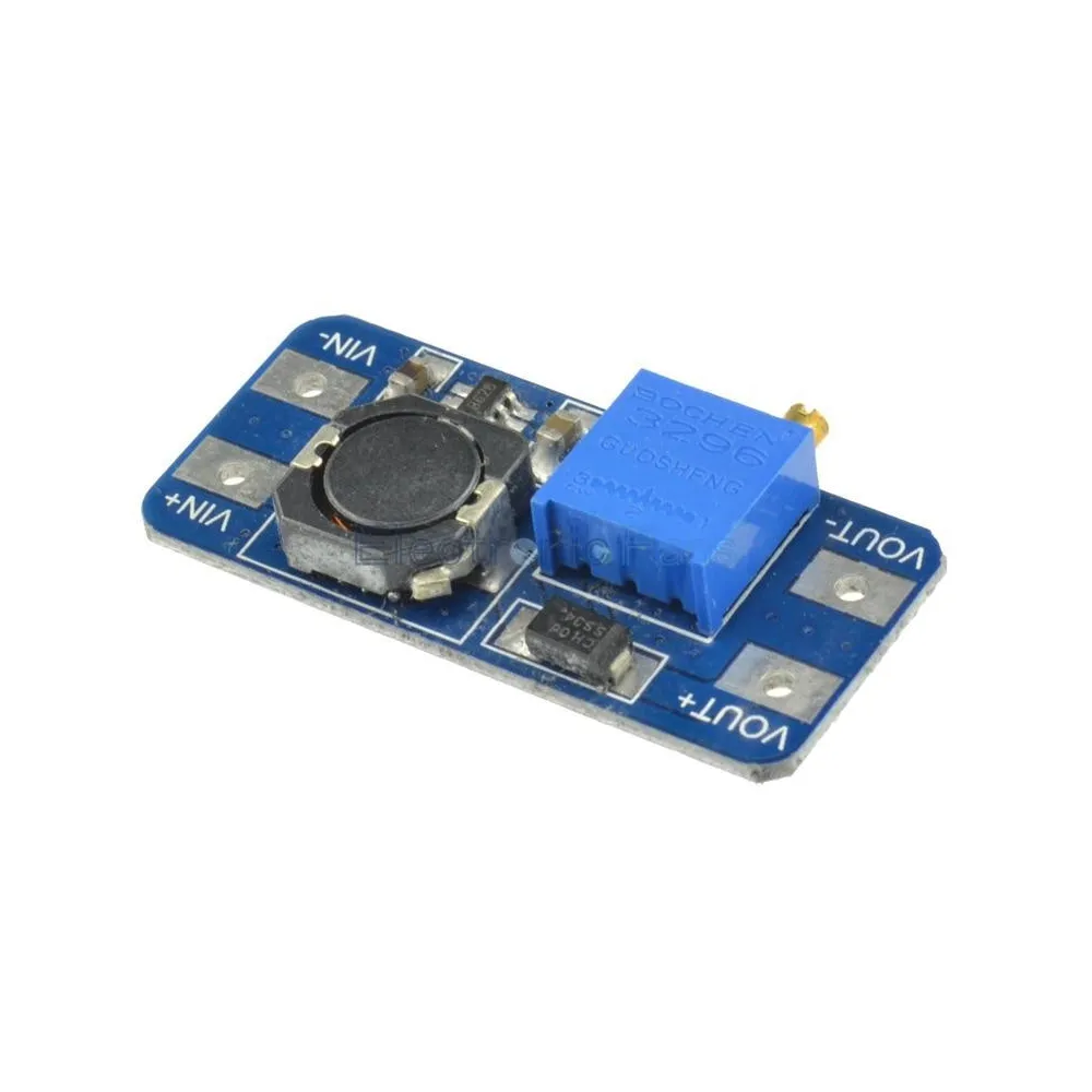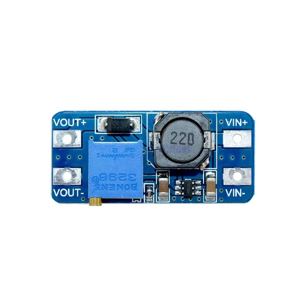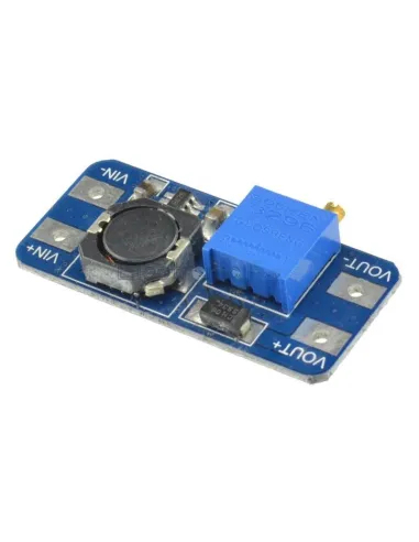Este módulo presenta el convertidor elevador MT3608 de 2 amperios (boost), que puede tomar voltajes de entrada tan bajos como 2 V y aumentar la salida a hasta 28V. El MT3608 presenta el cambio automático al modo de modulación de frecuencia de pulsos con cargas ligeras. Incluye bloqueo de bajo voltaje, limitación de corriente y protección de sobrecarga térmica.