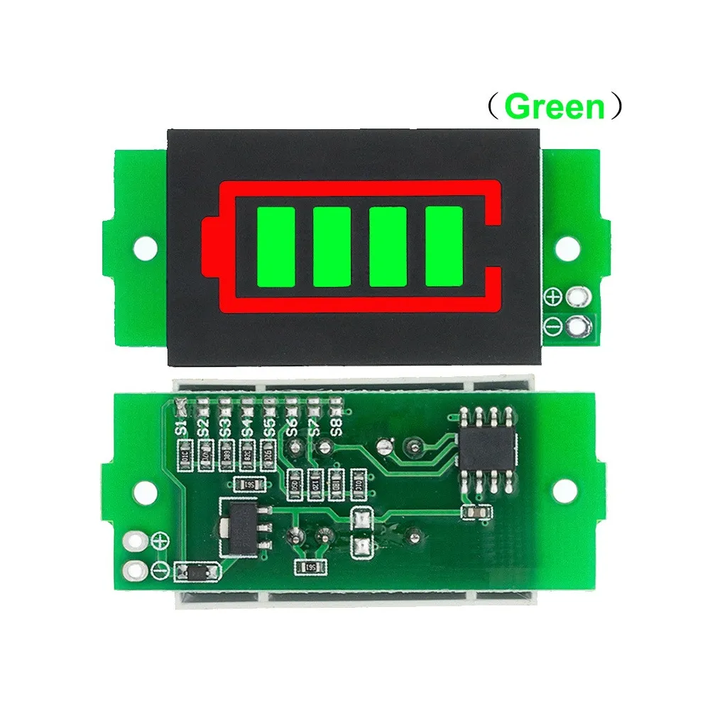Indicador de Batería Litio, lipo seleccionable de 1S a 8S Color verde que permite medir la carga de sus baterías desde una celda a ocho celdas el cual puedes seleccionar en la parte de atrás colocando un punto de soldadura en la celda que necesitas según sus requerimientos