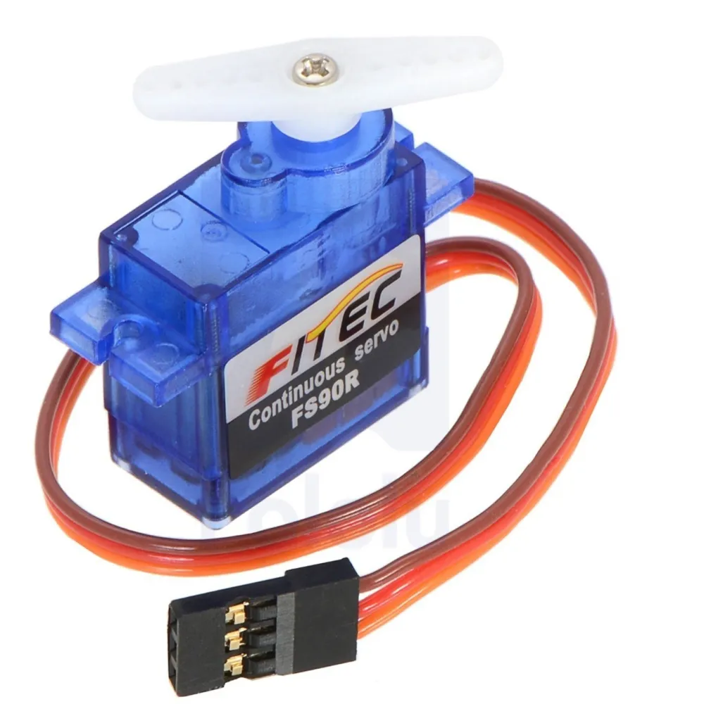 El FS90R es un servo de tamaño micro que ha sido construido por FEETECH específicamente para rotación continua. A 6 V, tiene una velocidad de rotación máxima de alrededor de 130 RPM (sin carga) y puede producir hasta 21 oz-in (1,5 kg-cm) de torque. El servo puede controlarse mediante una conexión directa a una sola línea de E / S del microcontrolador sin ningún tipo de electrónica adicional, lo que lo convierte en un excelente actuador en miniatura para proyectos de robótica para principiantes