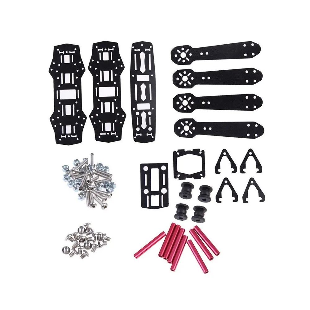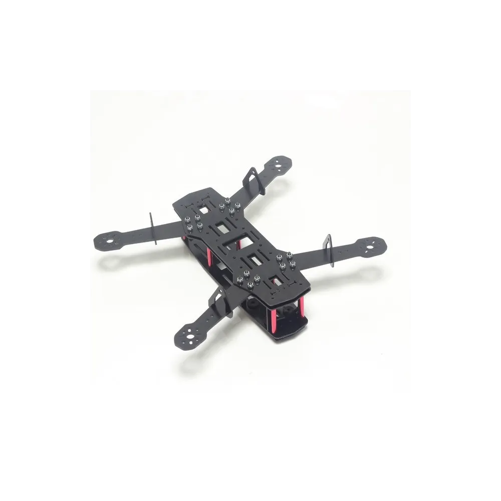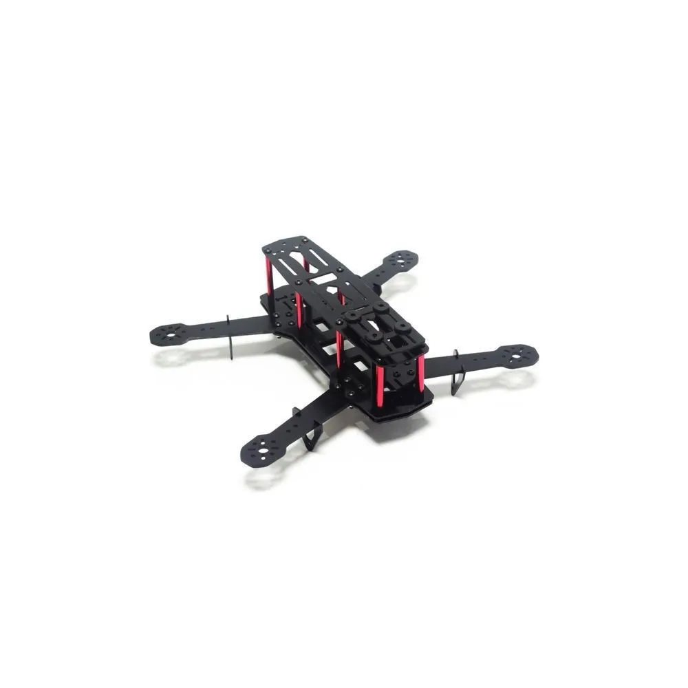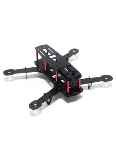 El chasis QAV250 es uno de los modelos de chasis más replicados en el mercado. Su principal ventaja es el gran espacio disponible para montar todos los accesorios de un drone racing e incluso una base antvibración superficial en la parte superior para colocar una cámara de grabación deportiva. El material del chasis son placas de fibra de vibrio, separadores de aluminio de 1,5 y 3 mm de espesor, tornillos allen de color rojo y acero.