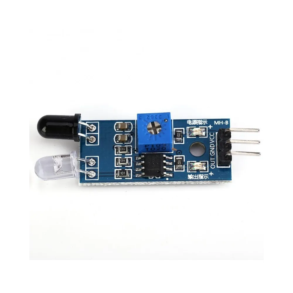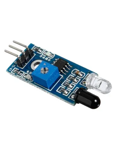 Transmisor y un receptor infrarrojo, el emisor emite una señal infrarroja que se refleja en un obstaculo la cual es recibida por el receptor, un led se enciende cuando se detecta un obstáculo. la sensibilidad puede ser ajustada mediante un potenciómetro. Este sensor puede usarse en robots evasores de obstáculos, seguidores de línea y otras aplicaciones.