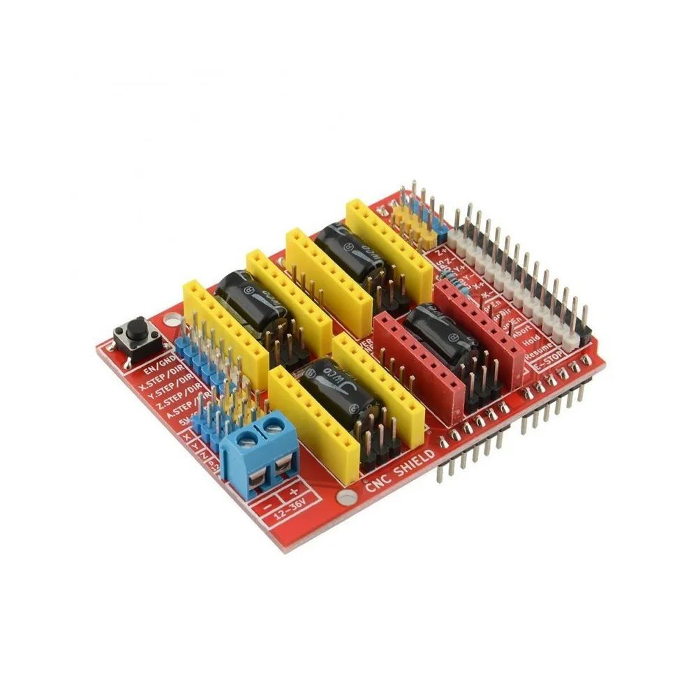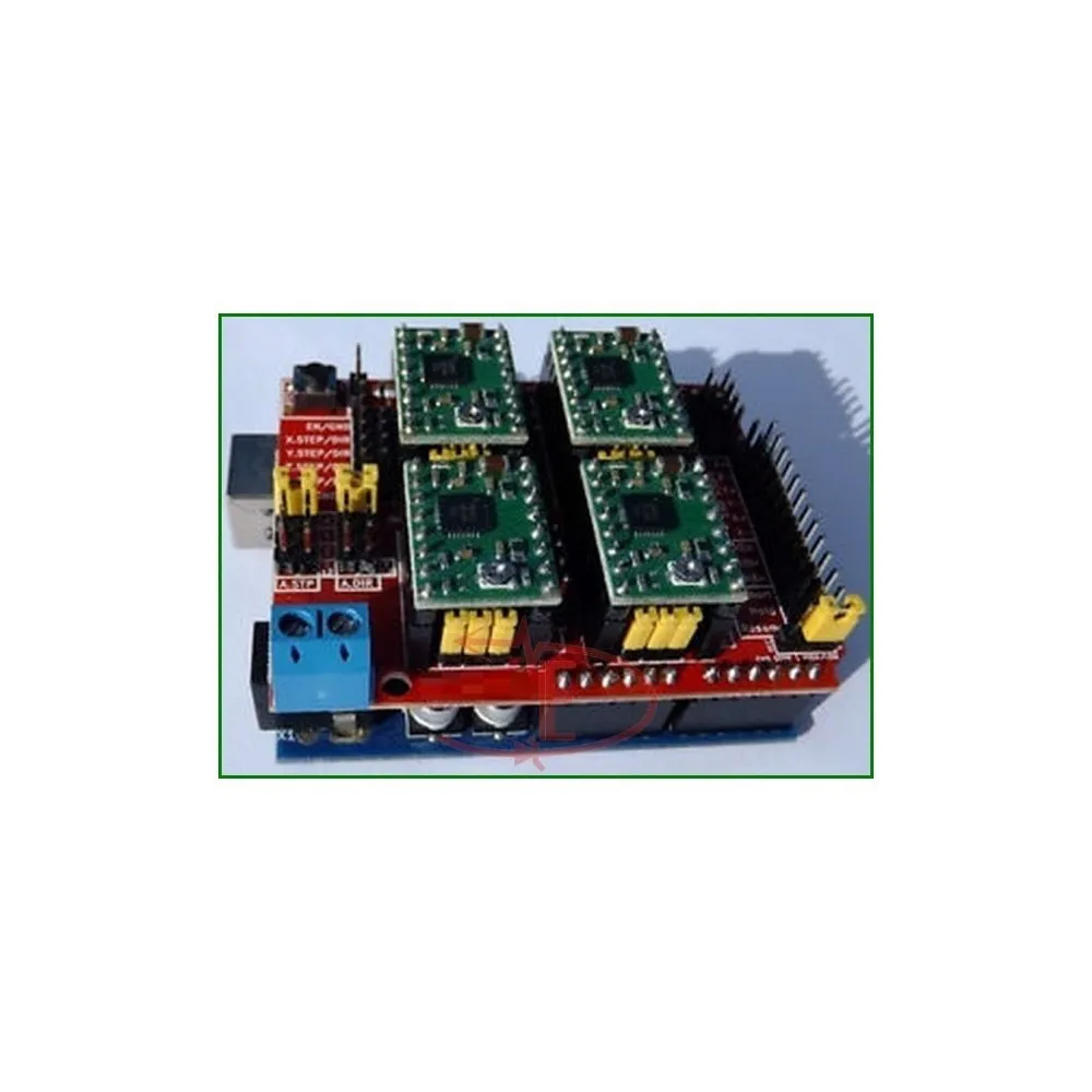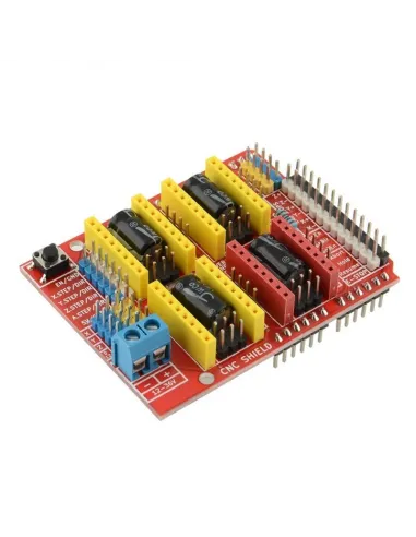 El CNC Shield para Arduino, hace que sus proyectos CNC sean faciles de montar haciendolos que funcionen en unas pocas horas. Utiliza el firmware de codigo abierto en Arduino para controlar 4 motores paso a paso (PAP o Stepper), donde cuenta con 4 zocalos, para insertar 4 controladores A4988. Con este Shield y un Arduino usted puede construir todo tipo de proyectos de robotica o proyectos CNC incluyendo enrutadores CNC, cortadoras laser e incluso maquinas pick & place´s (P&Ps), para el montaje de componentes SMD en circuitos electronicos.