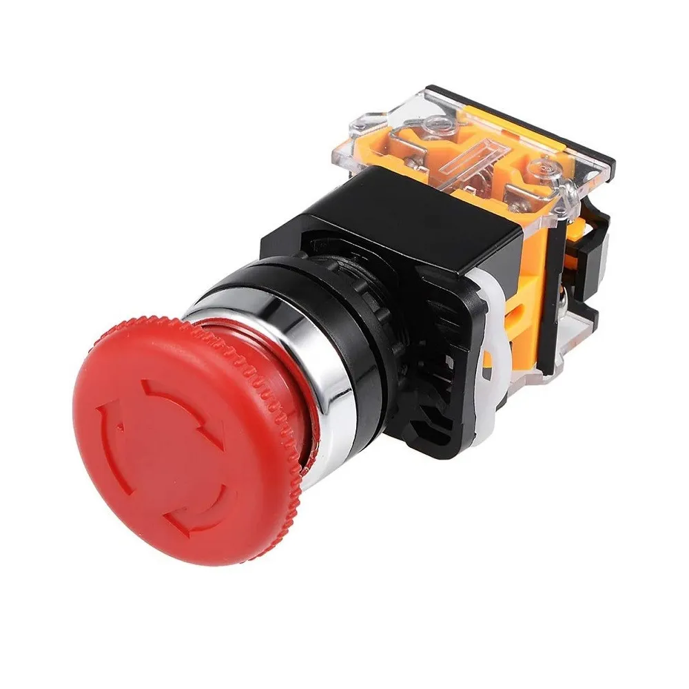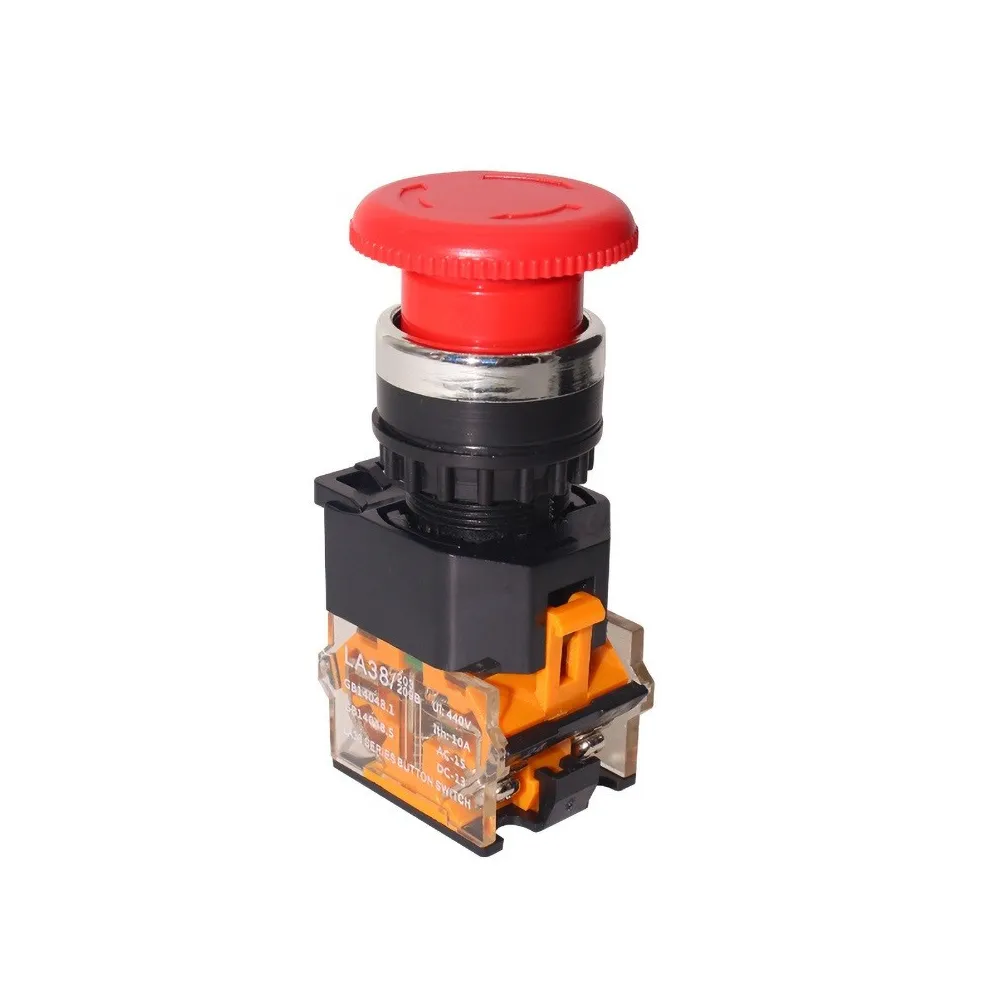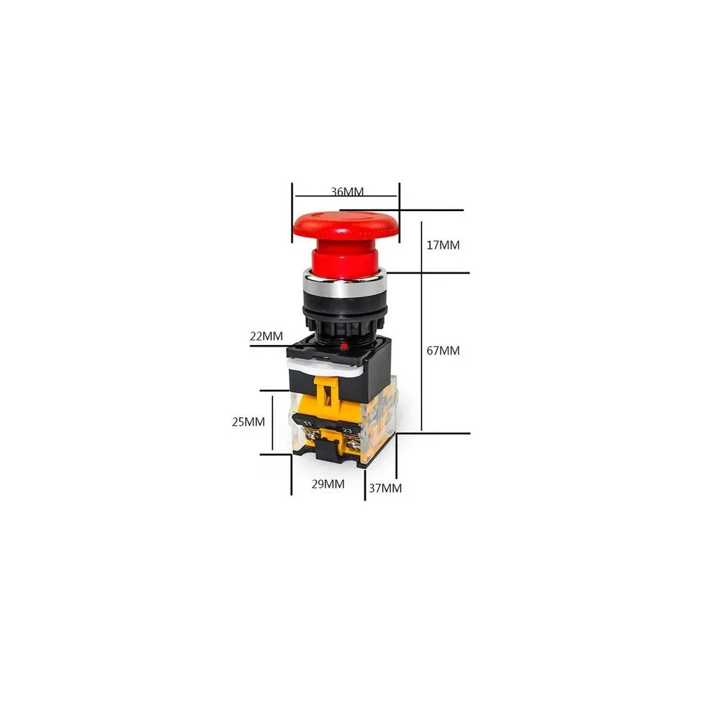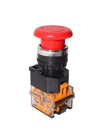 Botón para de emergencia o STOP, posee dos contactos uno Normalmente Cerrado NC (pines 11 y 12) y otro Normalmente abierto NA ( pines 23 y 24)
